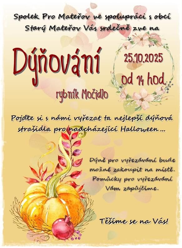 Tradiční DÝŇOVÁNÍ proběhne v sobotu 25. října 2025. Letos netradičně u rybníka "Močidlo" na návsi. Start ve 14.00 hodin. Těšíme se na vás!